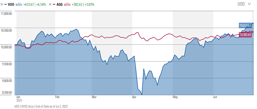The 2nd quarter began with a dramatic market selloff due to global tariff wars. U.S. stocks had dropped by ~20% after the first week in April (see chart below from February to April). However, we experienced a historically quick rebound, and stocks ended the quarter with solid gains, hitting an all-time high on June 30th. The recovery was driven by both easing trade tensions and strong corporate earnings. The chart below shows year-to-date performance of the S&P 500 index (shown in blue) and the U.S. Aggregate bond index (shown in red).